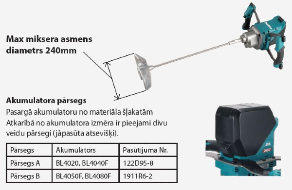 Īpaši jaudīgs 1200 W mikseris ar mehānisku 2 ātrumu reduktoru. Liels ātrums: 0-920 minˉ¹: vidējas viskozitātes materiāla sajaukšanai. Mazs ātrums: 0-500 minˉ¹: augstas viskozitātes materiāla, piemēram, betona, sajaukšanai.