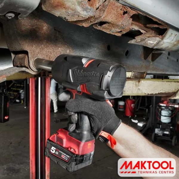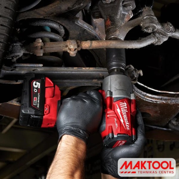 M18 FUEL™ augsta griezes momenta trieciena uzgriežņu atslēga nodrošina 1356Nm lielu stiprināšanas griezes momentu kompaktā izmērā (213mm), neizmantojot elektrobarošanas vadus un pneimatiku.